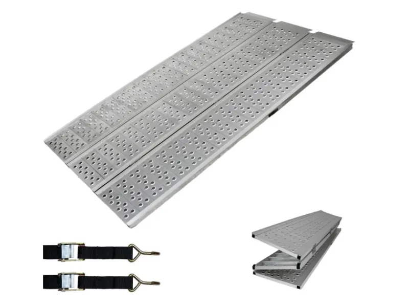 1x BedienungsanleitungTechnische Daten:Gesamtlänge (mit Auflagen)215 cmAuffahrlänge (ohne Auflagen)207 cmLänge Auflage8 cmGesamtbreite115 cmLaufflächenbreite113,6 cmHöhe (ausgeklappt)4 cmLänge | Breite | Höhe (zusammengeklappt)215 cm | 38,5 cm | 12 cmmin. Auffahrhöhe30 cmmax. Auffahrhöhe65 cmmin Steigung in % | °17% | 9,65°max. Steigung in % | °30% | 16,70°Tragkraft je Stück, bei min. 80cm Achsabstand (Luftbereifung aus Gummi)1.020 kg (340 kg je Element)Artikelgewicht je Stück21,80 kggeeignet für KettenfahrzeugeneinMaterialAluminiumBauweisezusammenklappbarFarbesilber