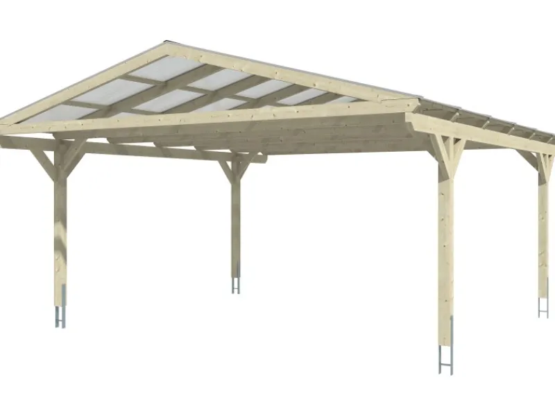 Mit einer Tragfähigkeit von 125 kg/m² (Schneelastzone 3, örtliche Besonderheiten nicht mit eingeschlossen) bietet es eine hohe Schneelast, sodass Sie auch im Winter bestens ausgestattet sind. Bei häufigem Schneefall empfehlen wir Ihnen das Dach regelmäßig zu säubern. Das Dach des Doppelcarports ist aus klaren Doppelstegplatten. Die Dacheindeckung überzeugt durch seine robuste, schlagfeste und witterungsbeständige Oberfläche. Die klaren Platten lassen viel Licht durch und schützen dabei vor UV-Einstrahlungen. Durch das zur Seite hin gerichtete Gefälle kann Niederschlag optimal abfließen.