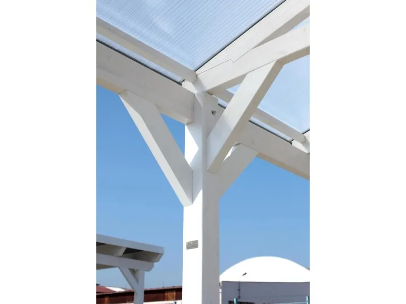Der Carport steht auf 4 robusten Pfosten mit einer Stärke von 12 cm x 12 cm zum Einbetonieren, die eine optimale Stabilität für das Grundgerüst gewährleisten. Das lasierte Leimholz im hellen Eichenstil weist eine hohe Formstabilität auf. Dadurch gehört es zu den härtesten und stabilsten Konstruktionsmaterialien. Die lasierte Oberflächenbehandlung bildet einen optimalen Rundumschutz. Sie ist atmungsaktiv und schützt vor Feuchtigkeit, Insekten und Pilzen. Des Weiteren ist sie beständig gegen Sonnen- und UV-Einstrahlung.
