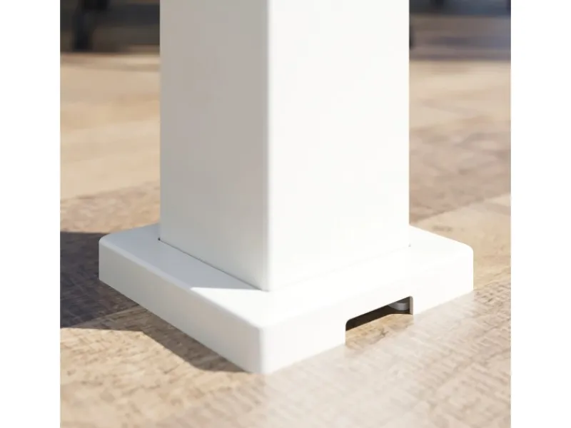 Der Abfluss in allen vier Schenkeln gewährleistet einen reibungslosen Ablauf, auch bei leicht unebenem Untergrund. Regenwasser wird durch die Kanäle in den Lamellen zu den darunter liegenden Balken geleitet und dann über die Beine abgeleitet. Entwässerungslöcher an den Beinen ermöglichen eine schrittweise Ableitung über dem Boden. Eine Entwässerungsrinne im Belag wird empfohlen und die Rinnen sollten von Laub befreit werden, abhängig von der Umgebungsbepflanzung.