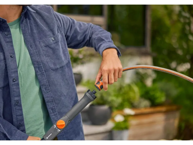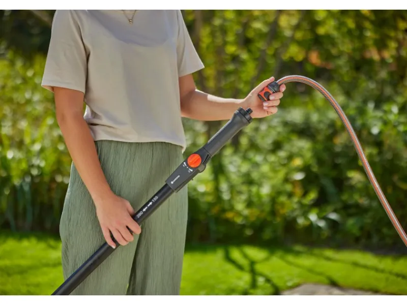 Nachdem der Gardena Teleskop-Stiel M – XL an den Gartenschlauch angeschlossen wurde, kann mit nur einem Handgriff die Wasserzufuhr am Griff stufenlos reguliert und abgesperrt werden. Dadurch entfällt der lästige Gang zum Wasserhahn während der Anwendung, was den Reinigungsprozess effizienter gestaltet.