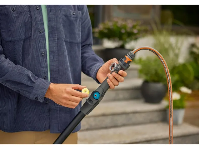 Das Gardena Shampoo sorgt für eine noch gründlichere Reinigung, indem es einfach in den Spender am Stiel eingesetzt wird. Die Dosierung kann je nach Bedarf angepasst werden, was eine effiziente Reinigung der Oberflächen ermöglicht.