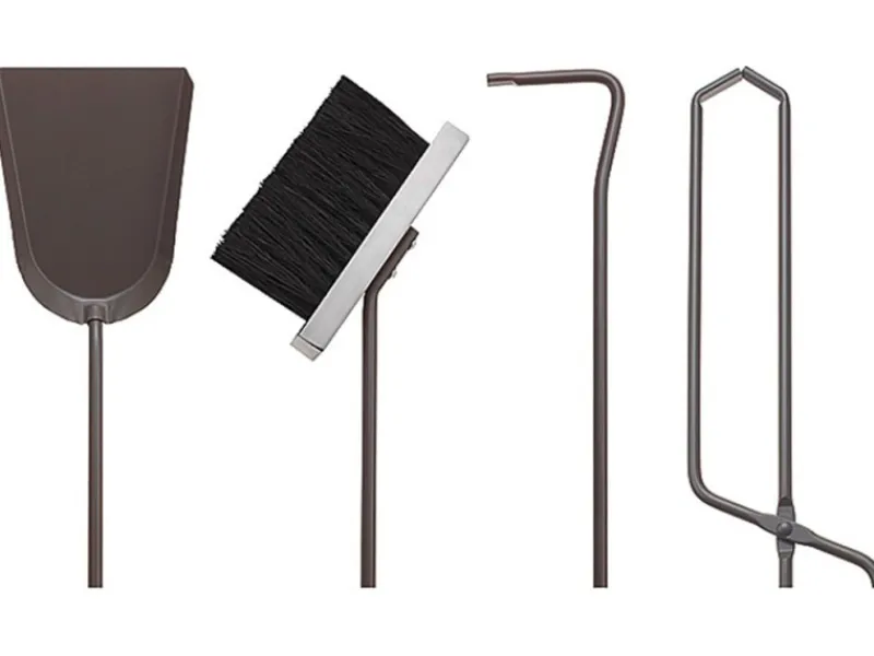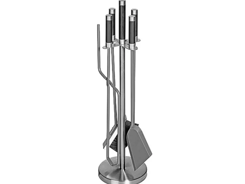 Das hochwertige Kaminbesteck aus Edelstahl beinhaltet eine Halterung, eine Schaufel, einen Besen, eine Zange und einen Feuerhaken.
