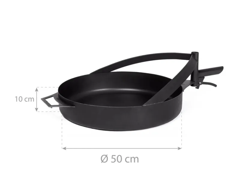 Die Pfanne ist nur in Kombination mit dem Befestigungsmast nutzbar und kann mit einem Handgriff am Mast befestigt werden. Dadurch ist sie einfach zu handhaben und ermöglicht ein komfortables Kochen über der Feuerschale.