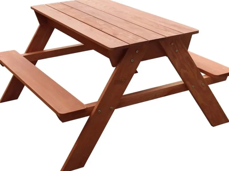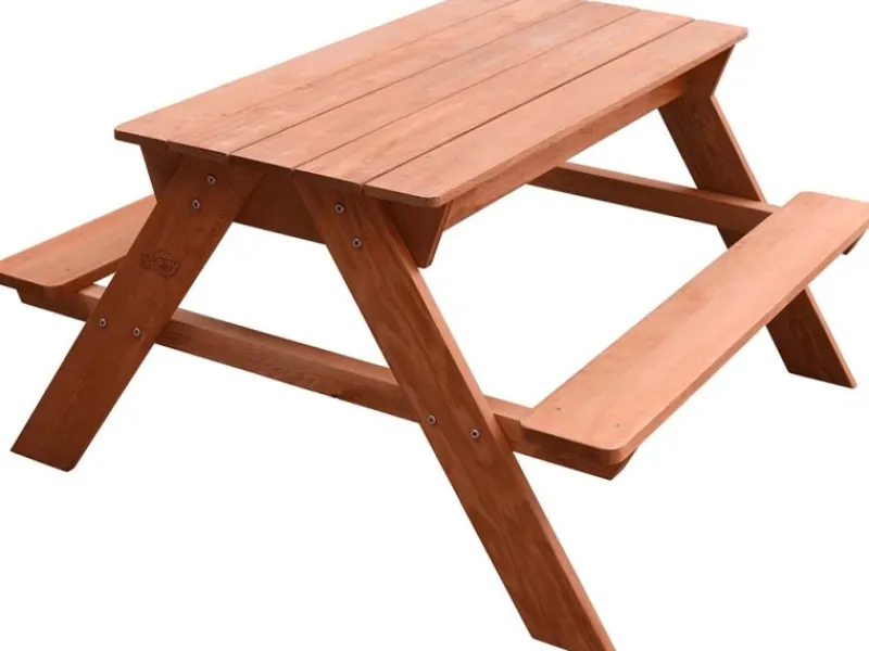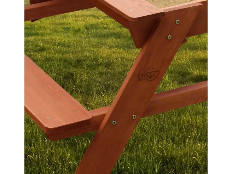 Der Picknicktisch aus 100 % zertifizierten FSC® Hemlock-Holz stammt aus bewirtschafteten Wäldern. Diese Holzart splittert nicht und ist von Natur aus beständig gegen Wettereinflüsse wie Regen und deshalb resistent gegen Verrottung. Der Picknicktisch ist auch mit einer speziellen Beize behandelt. Sie müssen den Sunny Sand- und Wasser Picknicktisch Dave nicht vor dem Gebrauch behandeln, Kinder können sofort sicher damit spielen.