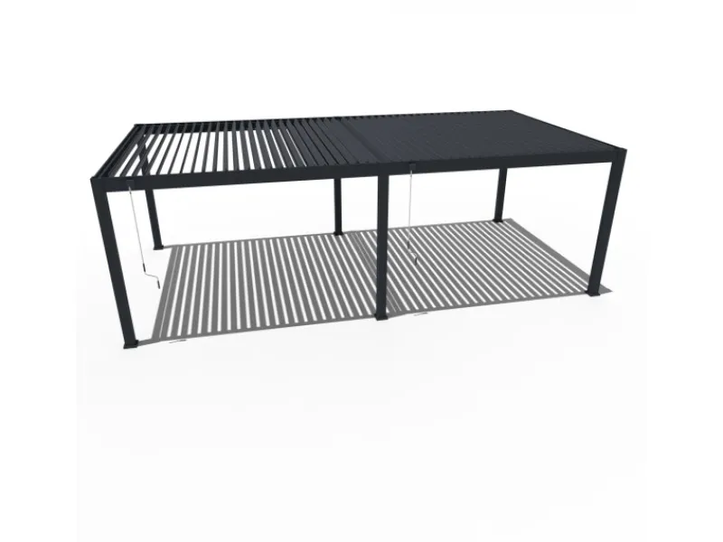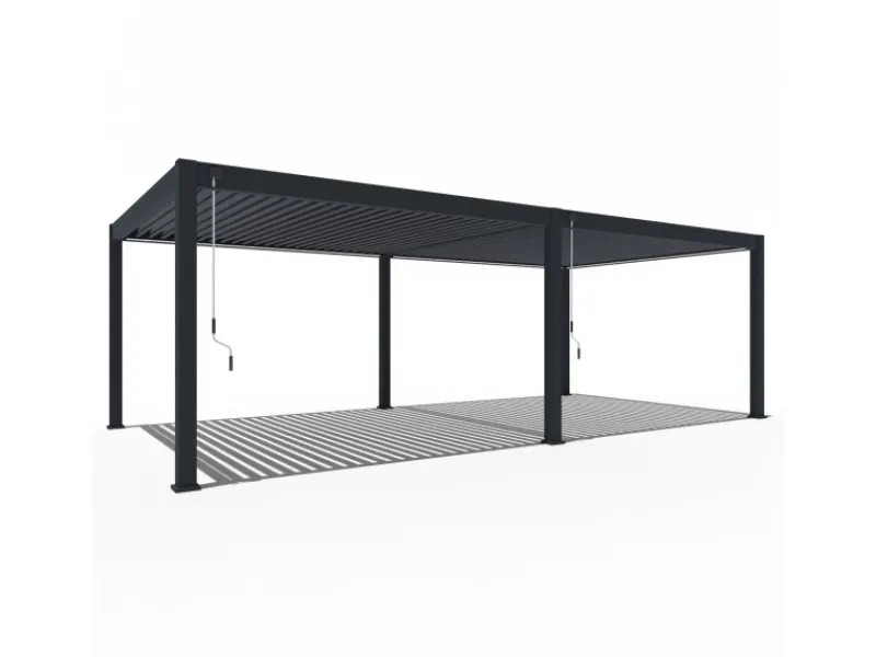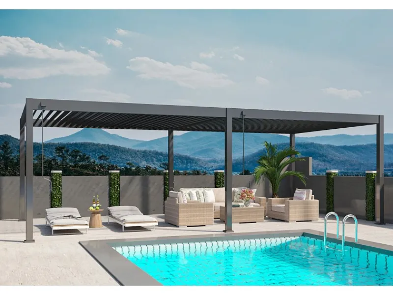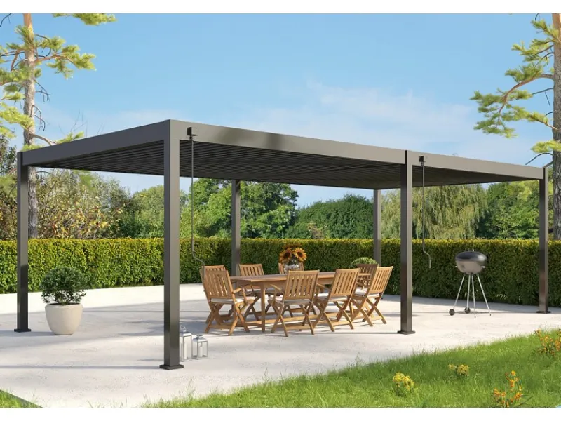 Die hochwertigen Aluminiumlamellen lassen sich bequem und stufenlos einstellen. Im Handumdrehen verändern Sie synchron den Neigungswinkel aller Lamellen und bestimmen hierdurch den passenden Lichteinfall. Somit lassen sich herrliche Lichtstimmungen erzeugen. Natürlich schützt Sie der Pavillon auch optimal gegen UV-Strahlung. Bei vollständig geschlossenen Lamellen bietet die Pergola Schutz vor Sonne und leichtem Regen. Die integrierte Regenrinne sorgt dabei dafür, dass Regenwasser kontrolliert über das Innere der Aluminium-Pfosten abgeleitet wird.