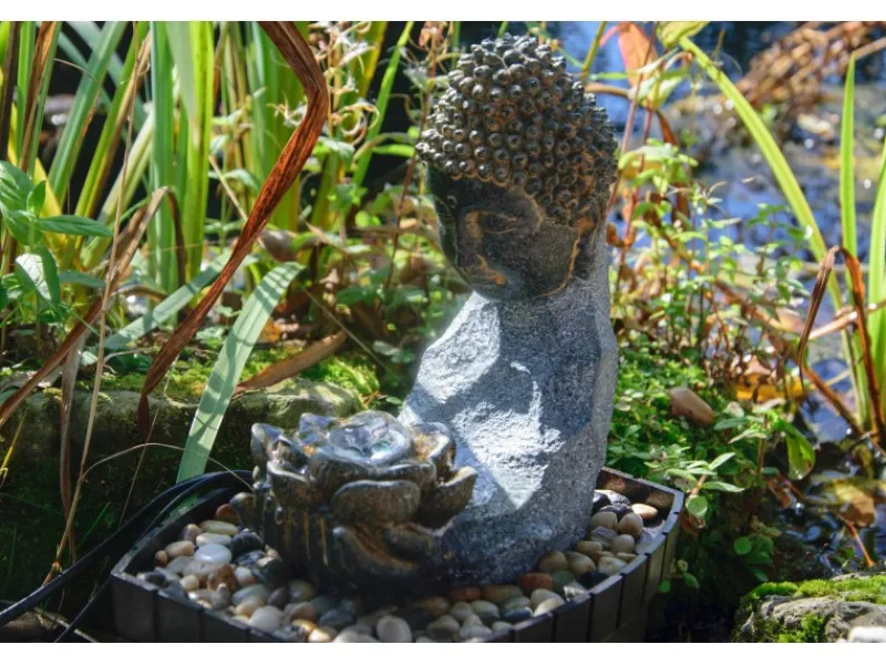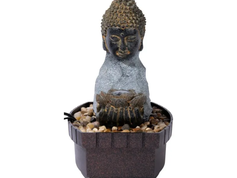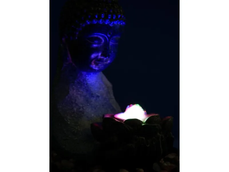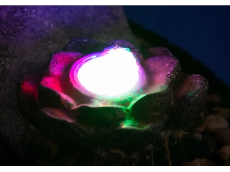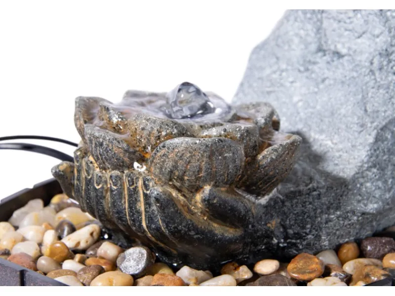Das Wasser sprudelt aus der Blüte, in deren Inneren LEDs für herrliche Lichteffekte sorgen. Die Abdeckung der Kunststoff-Unterschale kann mit den mitgelieferten Kieselsteinen ausgelegt werden. So erzeugen Sie ein entspannendes Wohlfühlambiente, das Sie den Stress im Alltag vergessen lässt. Der Springbrunnen ist ca. 20,5 cm x 16,5 cm x 27 cm groß und hat einen Energieverbrauch von 2 W. Neben dem Brunnen sind 200 g Ziersteine, ein ca. 1,6 m langes Netzkabel inkl. Pumpe und eine ausführliche Bedienungsanleitung im Lieferumfang enthalten.