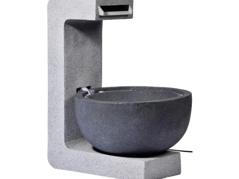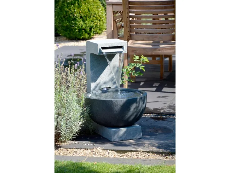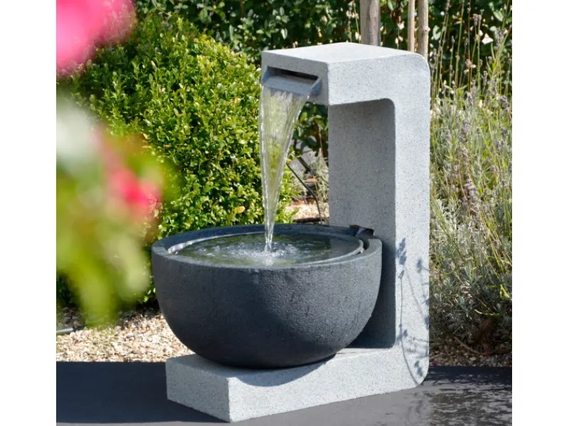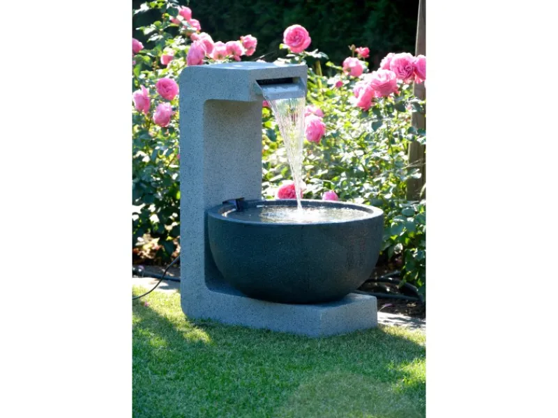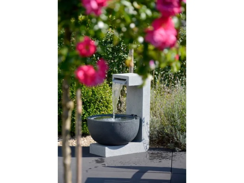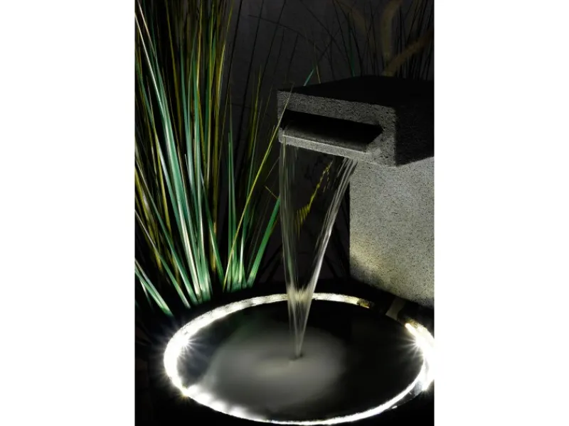 Das aus der Quellöffnung fließende Wasser plätschert beeindruckend in ein großes Auffangbecken nach unten, welches mit ca. 30 warmweißen LEDs umrandet ist. Der moderne Gartenbrunnen/Zimmerbrunnen kann durch seinen geschlossenen Wasserkreislauf im Innen- und Außenbereich verwendet werden.