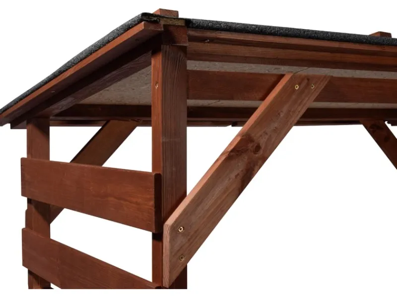 Das wasserdichte graue Bitumendach mit Dachüberstand schützt das Brennholz vor Regen und Schnee