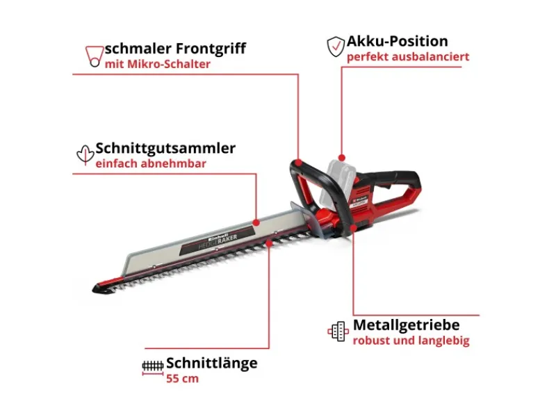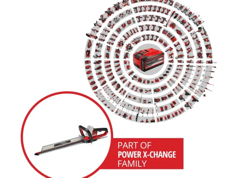 Die Akku-Heckenschere ist Mitglied der Einhell Power X-Change-Familie und wird mit einem 18 V Lithium-Ionen-Akku (separat erhältlich) der Plattform betrieben. Diesen Akku können Sie für alle anderen Einhell Gartengeräte und Werkzeuge der Akkuplattform nutzen. Der Kauf mehrerer Akkus derselben Leistung wird Ihnen erspart, was zu mehr Ordnung im Keller oder Geräteschuppen führt. Die Akkus der Power X-Change Familie verfügen über eine praktische Füllstandsanzeige mit 3 LEDs, die Ihnen eine vorausschauende Arbeitsweise ermöglicht.