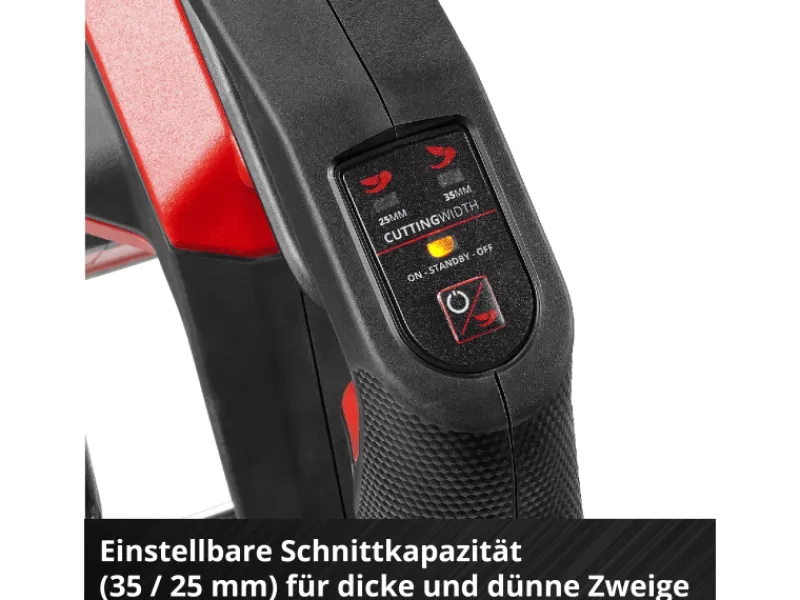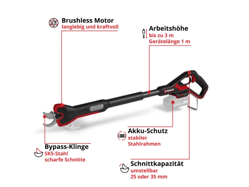 Angetrieben wird das Gerät von einem Einhell Brushless Motor, der mehr Kraft und eine längere Laufzeit als herkömmliche Kohlebürsten-Motoren bietet. Die Akku-Astschere schneidet mühelos Äste bis zu einer Dicke von 35 mm in einer Arbeitshöhe von bis zu 3 Metern. Dünnere Äste bis 25 mm werden schneller geschnitten.