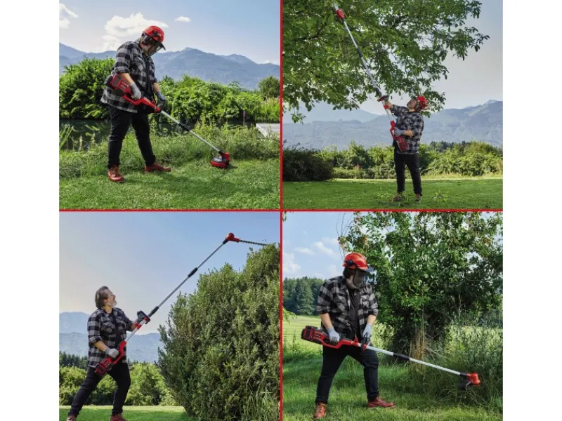 Der Zusatzhandgriff kann in der Höhe verstellt und so an die Aufgabe oder die Körpergröße des Anwenders angepasst werden. Mit einer Verlängerungsstange erweitern Sie die Reichweite um 67 cm und auch höhere Hecken oder Äste können gestutzt bzw. geschnitten werden. Mit dem Tragegurt ist die Verwendung bequem und dank Standfläche können Sie das Gerät auch mal kurz an einer Mauer oder Hauswand abstellen.