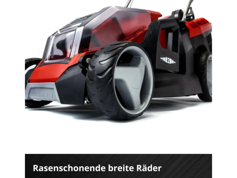 Der Highwheeler ist mit seinen großen Rädern rasenschonend. Er verfügt über eine 6-stufige zentrale Schnitthöhenverstellung sowie einen 3-fach höhenverstellbaren Führungsholm für eine bequeme Bedienung. Dank klappbarem Holm ist der Mäher auch einfach zu verstauen. Der großzügig bemessene Grasfangkorb fasst 40 l und hat eine Füllstandsanzeige. Der Mäher mit einem hochwertigen, schlagzähen Kunststoffgehäuse ist zudem mit einem integrierten Tragegriff ausgerüstet, mit dem sich der Mäher einfach transportieren lässt.