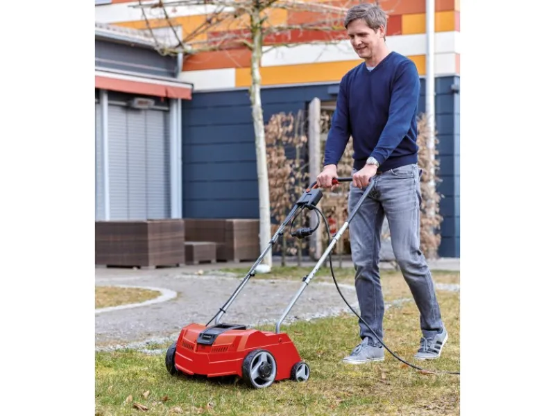 Dank Arbeitstiefeneinstellung in drei Stufen lässt sich der Vertikutierer gut auf die Anforderungen von Boden und Bewuchs einrichten. Eine zusätzliche Parkposition schützt zuverlässig die Messer und gleichzeitig den Untergrund. Die großflächigen Räder erleichtern das Arbeiten in unwegsamen Gelände und schonen dabei den Rasen. Das Gerät verfügt über ein robustes Gehäuse aus hochwertigem, schlagzähem Kunststoff. Dank klappbarem Führungsholm lässt sich der Vertikutierer platzsparend unterbringen. Das Gerät eignet sich für Rasenflächen bis ca. 300 m² empfohlen.