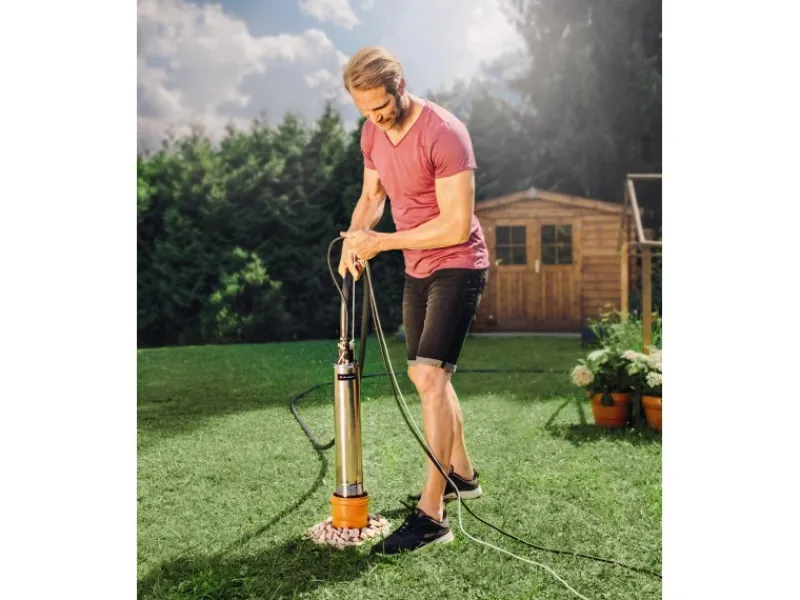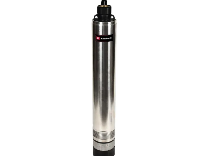 Die Einhell Tiefbrunnenpumpe GC-DW 1045 N ist eine robuste Basispumpe zur Förderung von Klarwasser für Gärten oder Brauchwasser im Haushalt und auch geeignet für den Aufbau einer Rasensprinkleranlage und großflächigen Gartenbewässerungssystemen. Die schlanke Tiefbrunnenpumpe ist für Brunnen, Reservoirs sowie Zisternen ideal geeignet. Bis zu 19 Meter in die Tiefe kann die Pumpe von Einhell mit dem mitgelieferten Seil abgelassen werden, an zwei Aufhängeösen kann sie fest und sicher fixiert werden. Mit dem starken 1000 Watt-Motor fördert die Tauchpumpe bis zu 6500 Liter Wasser pro Stunde. Ein mehrstufiges Pumpenrad liefert den gleichmäßigen Druck. Das integrierte Rückschlagventil verhindert das Zurückfließen beim Ausschalten. Die hochwertigen Materialien und die Einzelkomponenten aus rostfreiem Edelstahl gewähren eine lange Lebensdauer: Das Pumpengehäuse besteht aus rostfreiem Edelstahl und der robuste Druckanschluss ist mit einem Edelstahl-Einsatz ausgestattet. Auch das Schmutzsieb besteht aus Edelstahl. Die hochwertige Gleitringdichtung sorgt für eine lange Lebensdauer. Ein thermischer Überlastschutz schützt das Gerät bei einer Überlastung und schaltet in einem solchen Fall automatisch ab. Der Schlauchanschluss ist gut erreichbar an der Pumpenoberseite integriert.