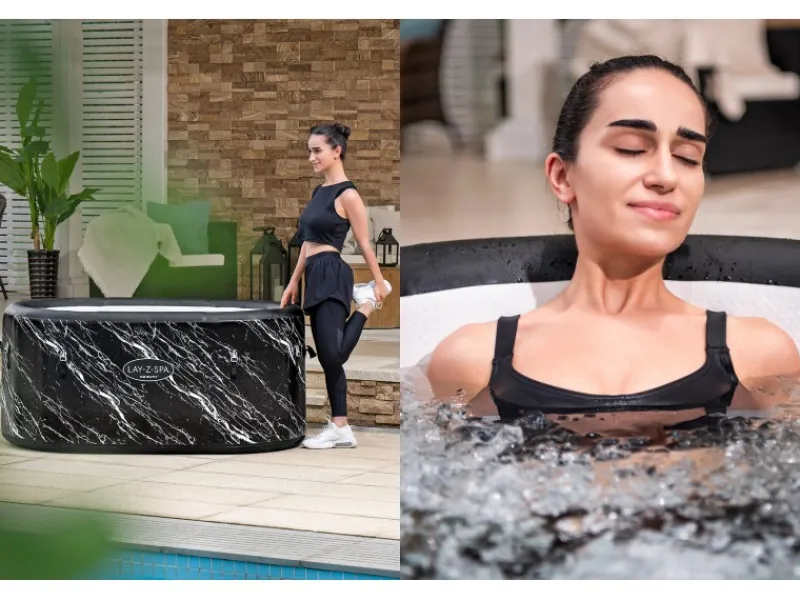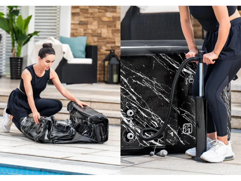 Die edle Marmor-Optik (Marquita) des Eisbads verleiht deinem Außenbereich eine stilvolle und moderne Note. Das elegante Design fügt sich nahtlos in jede Umgebung ein und sorgt für ein luxuriöses Ambiente.