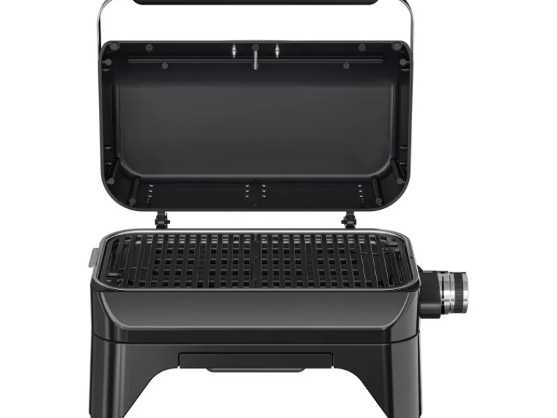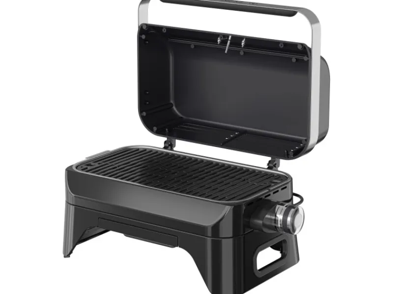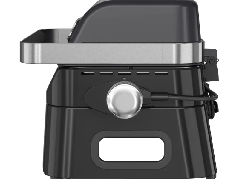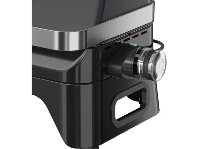 Der elegante schwarz emaillierte Stahldeckel erhält die Hitze und ermöglicht effektives Grillen, während clevere weiche und runde Griffe ein bequemes Tragen ermöglichen. Die Brennerabdeckung im Grillrost ist integriert, um Stichflammen zu reduzieren. Die stufenlose Hitzeregulierung am Drehknopf mit blauer LED-Anzeige, die bei Erreichen der gewünschten Voreinstellung erlischt, bietet präzise Kontrolle. Die Kabelhalterung mit einem 1,90 m langen Kabel und EU-Typ-E-Stecker (mit F-Kompatibilität) sorgt für ordentliche und sichere Nutzung.