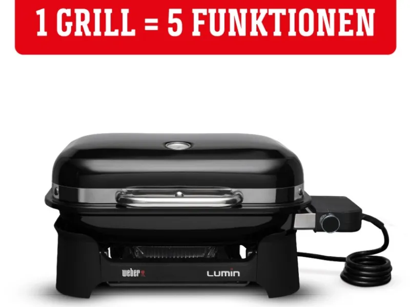 Dieser multifunktionale Elektrogrill erreicht Temperaturen von über 315 °C für ausgezeichnetes Anbraten, während die Rauchzufuhr das gewünschte Grillaroma noch weiter verstärkt. Ideal zum Anbraten, Räuchern, Dämpfen oder Kochen mit verschiedenen Gareinstellungen, außerdem hält er zudem die Speisen warm, sodass sich alle jederzeit selbst bedienen können Auch das Grillen von tiefgekühltem Grillgut ist möglich, indem es während des Vorheizens aufgetaut wird. Der zusammenklappbare Stand lässt sich einfach aufstellen und bietet zusätzlichen Platz und integrierte Besteckhalter. Der neue Lumin Compact Elektrogrill mit Stand von Weber ist modern, praktisch und so konzipiert, dass er alle Ihre Wünsche nach einem guten Geschmack erfüllt und sich zugleich gut in Ihren Außenbereich einfügt.