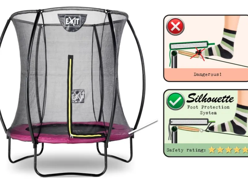 Das EXIT Silhouette Trampolin auf Füßen ist ein rundes Trampolin von guter Qualität. Das Sicherheitsnetz, dass standartmäßig zu dem Trampolin auf Füßen mitgeliefert wird, ist mit gebogenen Pfosten ausgestattet sodass das Netz straff gespannt ist. Der hochwertige Schutzrand bedeckt die galvanisierten Federn völlig und ist mit einem speziell entwickelten Fußschutzsystem versehen, sodass dein Fuß nicht zwischen die Federn kommen kann. Die kräftigen Federn stehen Garant für gute Sprungkraft. Der Rahmen des Silhouette Trampolins ist galvanisiert und pulverbeschichtet sodass Rost keine Chance hat. Erlebe endlos viel Springspaß auf den EXIT Silhouette Trampolinen!