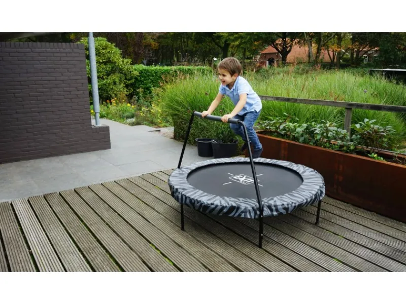 Das EXIT Tiggy junior Trampolin ist ein Minitrampolin für Kinder von drei bis fünf Jahren. Dieses kompakte und runde Trampolin ist mit einem Bügel für extra Halt beim Springen versehen und hat eine niedrige Stufe, so dass auch Kleinkinder leicht auf das Trampolin gelangen können. Einzigartig am Trampolin ist der Schutzrand mit coolem Tigerprint. Im Gegensatz zu größeren Trampolinen hat dieses Trampolin Gummibänder anstelle von Federn. Die Gummibänder sorgen für einen flüssigen Bounce und eine sanfte Landung, so dass der Körper kaum belastet wird und kleine Kinder mit Freude und voller Stolz ihre ersten Sprünge zeigen können. Der Bügel am Trampolin bietet zusätzliche Unterstützung und Halt, so dass Kleinkinder sicher auf der Stelle springen können. Wird doch mal versehentlich daneben gesprungen? Dank des weichen Schaumstoffs rund um Bügel und Schutzrand wird Ihr Kind immer sanft aufgefangen. Schließlich deckt der Schutzrand die Gummibänder des Trampolins vollständig ab. Das Trampolin Tiggy junior von EXIT Toys ist einfach aufzubauen. Innerhalb einer halben Stunde ist das Trampolin gebrauchsfertig. Ein weiterer Vorteil des EXIT Tiggy junior ist, dass er durch seine kompakte Form auch für den Innenbereich geeignet ist. Wenn das Wetter nicht so gut ist, können Sie das Trampolin einfach drinnen aufstellen. Die Kleinen können das ganze Jahr über auf dem EXIT Tiggy Junior Trampolin springen!