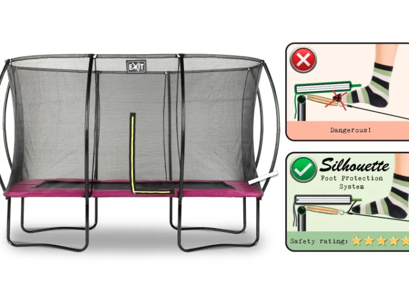 Das EXIT Silhouette Trampolin auf Füßen ist ein rechteckiges Trampolin. Das Sicherheitsnetz, das standartmäßig bei Trampolinen auf Füßen mitgeliefert wird, ist mit gebogenen Ständern ausgestattet, sodass das Netz straff gespannt steht. Der hochwertige Schutzrand deckt die galvanisierten Federn völlig ab und ist mit einem speziell entwickelten Fußschutzsystem ausgerüstet, damit dein Fuß nie zwischen die Federn kommen kann. Die soliden Federn stehen für eine gute Sprungkraft Garant. Der Rahmen des Silhouette Trampolins ist galvanisiert und pulverbeschichtet, damit Rost keine Chance hat. Auf den rechteckigen EXIT Silhouette Trampolinen erlebst du endlos viel Springspaß!