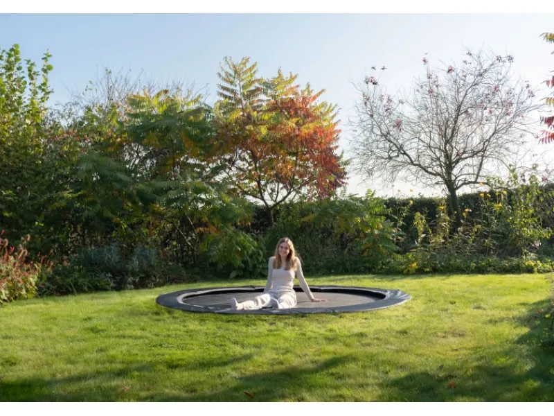Das Exit InTerra ebenerdige sports Trampolin ist ein matt-schwarzes, rundes Inground-Trampolin. Dieses Trampolin wird ohne Sicherheitsnetz geliefert und wird in Bodenhöhe vollständig im Rasen eingebettet. Das sorgt für eine moderne und ruhige Optik und einen problemlosen Einstieg: Du kannst direkt auf das Tuch springen. Die raffiniert entworfene Konstruktion des Trampolins ermöglicht eine besonders leise und reibungslose Sprungerfahrung.Das InTerra ebenerdige sports Trampolin verfügt über ein innovatives Polster-Liftsystem. Dank dieses Systems berühren die Polsterungen beim Springen weder das Sprungtuch noch die Federn des Trampolins. Stattdessen schwebt es sozusagen oberhalb davon. Auf diese Art und Weise kann die Luft bei jedem Sprung an der Unterseite der Polsterung entweichen. Das Ergebnis? Ein hoher, sanfter und leiser Sprung. Die flexiblen, geraden Federn des Trampolins sorgen außerdem für eine komfortable Landung.Elastische Bänder sorgen dafür, dass die Polsterung nach jedem Sprung automatisch in die richtige Position zurückkehrt. Dadurch sind die Federn ständig sicher abgedeckt und die Polsterung bleibt jederzeit an Ort und Stelle. Zudem ist das Sprungtuch mit einem speziell von Exit Toys entwickelten Foot Protection System (FPS, Fußschutzsystem) ausgestattet. Du kannst also beim Trampolinspringen nie mit deinem Fuß zwischen die Federn gelangen. Für jahrelanges Sprungvergnügen ist der Rahmen des eingegrabenen Trampolins verzinkt und pulverbeschichtet. So hat Rost keine Chance und das Trampolin ist witterungsbeständig. Das Trampolin ist zu 100 % reparierbar. Das heißt, dass du jedes Einzelteil bei Bedarf ersetzen kannst.