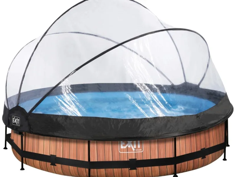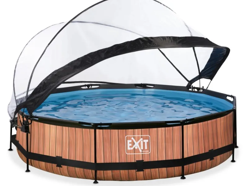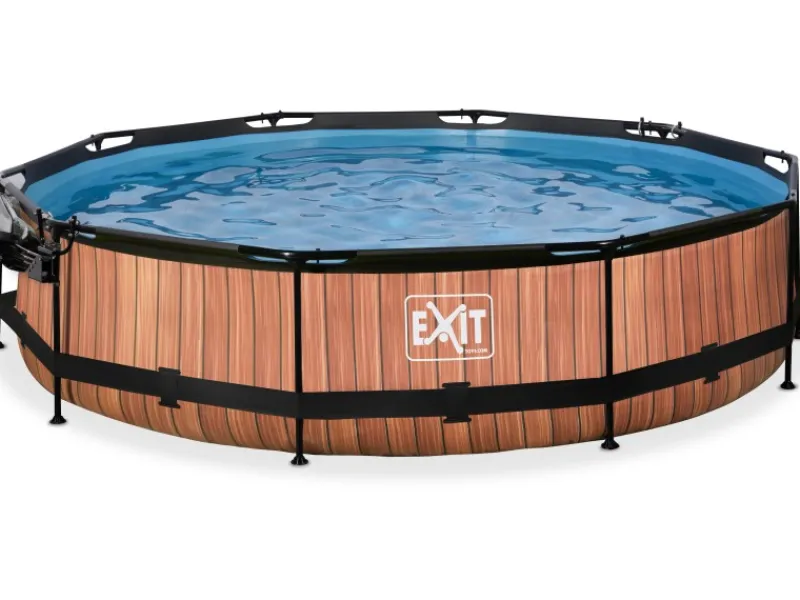 Der EXIT Wood Pool 360×76 cm ist ein großer runder Rahmenpool mit Abdeckung. Der Pool ist standardmäßig mit einer Filterpumpe ausgestattet und fällt durch sein tolles Holzmuster zwischen anderen Pools auf. Entdecken Sie, wie stabil ein runder Aufbaupool sein kann: der pulverbeschichtete stählerne Rahmen und die starken Füße des EXIT Wood Pools sorgen dafür, dass der Pool immer stabil steht und jahrelang genutzt werden kann. Die mitgelieferte Filterpumpe hält das Wasser sauber und in Bewegung, sodass einer Verschmutzung des Wassers entgegengewirkt wird. Mit der EXIT Abdeckung für Pools sind Sie nicht länger von Wettervorhersagen abhängig. Die Abdeckung sorgt dafür, dass kein Schmutz in das Wasser gelangen kann und hält die Wärme der Sonne unter der Abdeckung. Die Abdeckung ist sehr einfach durch den einzigartigen Scharniermechanismus zu öffnen und dank der durchsichtigen Folie verpassen Sie nichts, was außerhalb des Pools passiert. Das tolle Holzmuster und der schwarze Rahmen geben dem Wood Pool eine einzigartige Ausstrahlung und dank des natürlichen Aussehens integriert sich der Pool völlig in Ihren Garten. Die Innenseite des Pools ist blau, sodass Sie das frische Schwimmbad-Gefühl haben.