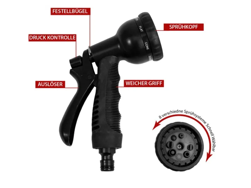 Die mitgelieferte Pistolengriffbrause verfügt über 8 verschiedene Sprühfunktionen: Center, Mist, Angle, Full, Soaker, Shower, Cone, Flat. Am Kopf der Brause sind deutliche Markierungen angebracht und die Sprühmuster lassen sich mühelos einstellen.