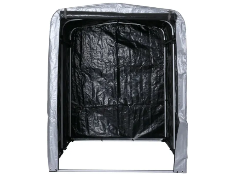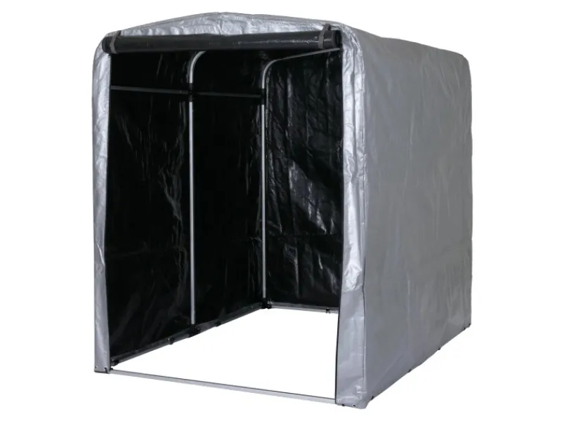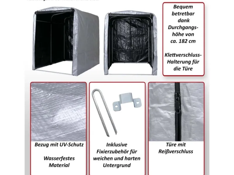 – Durch seine Höhe ist diese Aufbewahrungsgarage bequem betretbar und bietet Platz für 3-4 Fahrräder. Dank des Fixierzubehörs kann die Foliengarage sicher am Untergrund verankert werden.