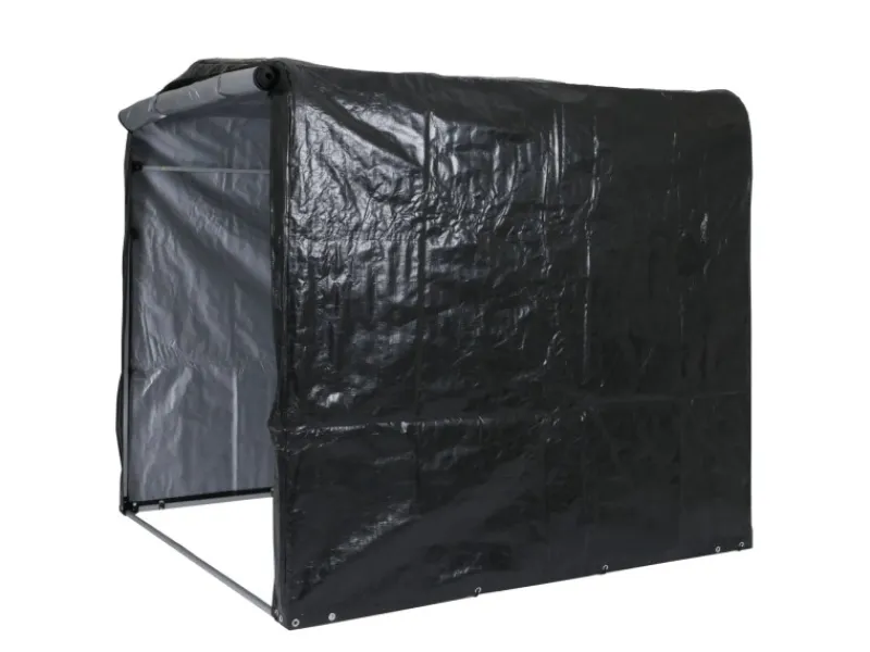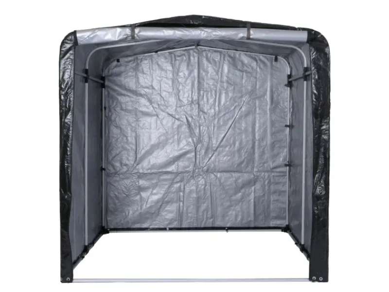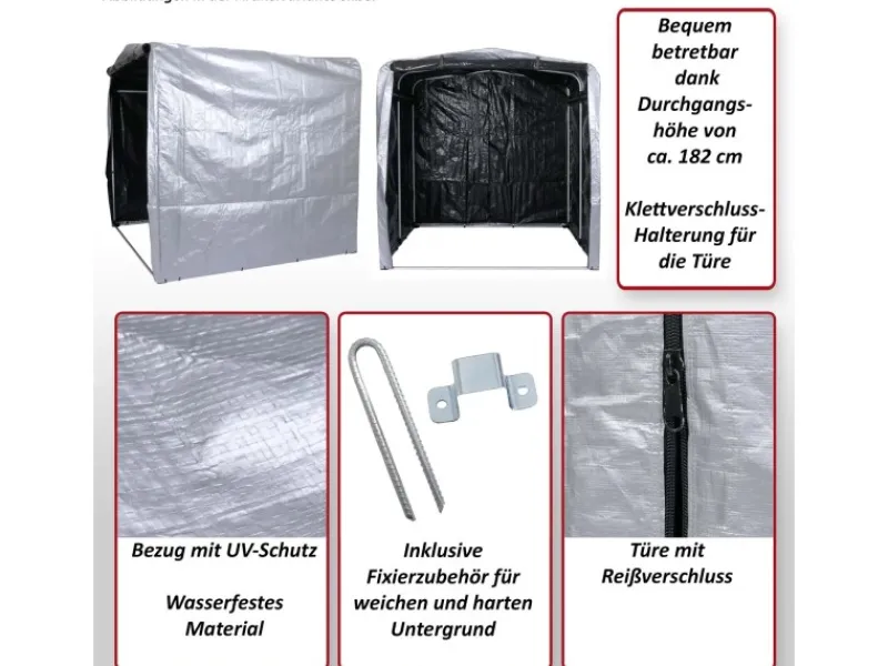 – Durch seine Höhe ist diese Aufbewahrungsgarage bequem betretbar und bietet Platz für 4-5 Fahrräder. Dank des Fixierzubehörs kann die Foliengarage sicher am Untergrund verankert werden.