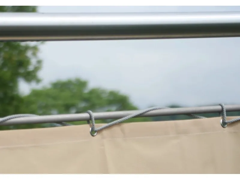 Dank der vorgefertigten Metallösen lässt sich die fertige Balkonverkleidung unkompliziert montieren. Die Ösen befinden sich an beiden Längsseiten, haben einen Innendurchmesser von Ø 10 mm und sind alle 24,5 cm gesetzt. Mit Hilfe der zwei 7 m langen Kordeln in passendem Sisal (im Lieferumfang enthalten) lässt sich die Balkonverkleidung einfach am Geländer befestigen.