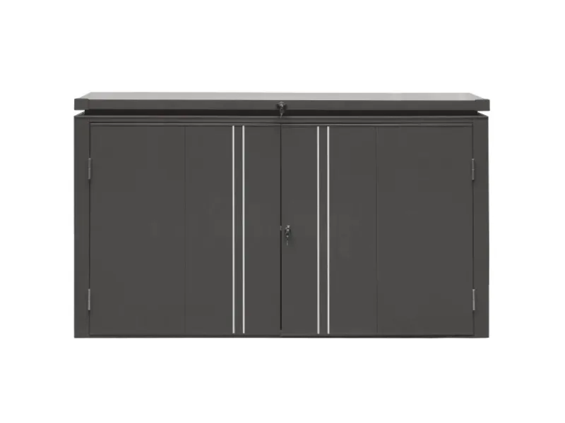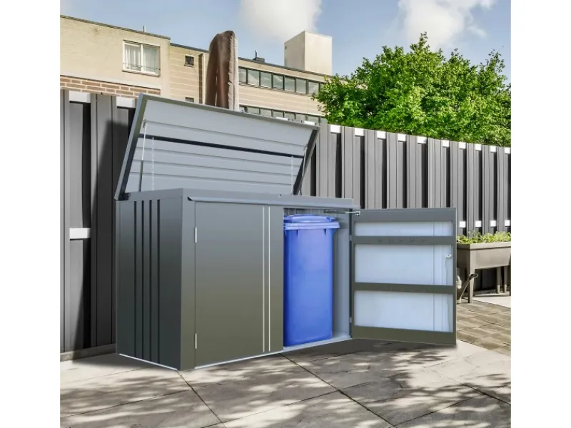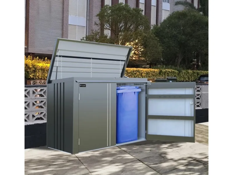 Schützen Sie Ihre Mülltonnen stilvoll und praktisch! Unsere Mülltonnengarage bietet Platz für bis zu drei 240-Liter-Mülltonnen und sorgt dafür, dass Ihre Abfallbehälter stets ordentlich, geschützt und vor Witterungseinflüssen bewahrt werden. Sie verfügt über eine große Deckelklappe, die das Entleeren der Tonnen erleichtert, sowie eine breite Doppel-Flügeltür für einfachen Zugang. Druckfedern sorgenfür ein sanftes und leises Öffnen und Schließen der Türen und Klappe. Zudem sind Türen und Klappe separat abschließbar, um maximale Sicherheit zu gewährleisten. Das moderne Design fügt sich harmonisch in jeden Garten oder Hof ein und sorgt für eine aufgeräumte Optik. Einfach zu montieren und langlebig – die perfekte Lösung für ein sauberes und gepflegtes Zuhause!