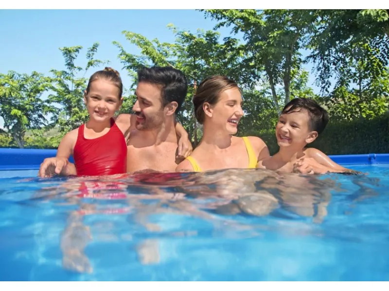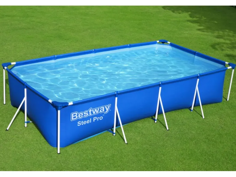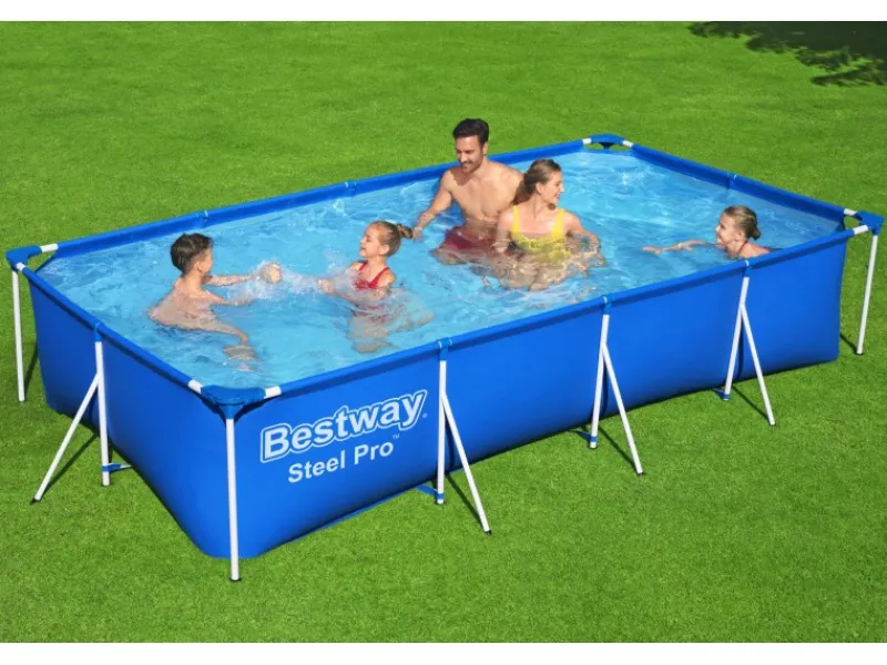 Mit dem Bestway Frame Pool Steel Pro holen Sie sich ausgelassenen Badespaß direkt nach Hause. Ganz ohne Schnickschnack kann der korrosionsbeständige Stahlrahmen mit Antihaftbeschichtung dieses Swimmingpools (400 x 211 x 81 cm) durch stabile T-Verbinder im Handumdrehen aufgebaut werden. Danach heißt es: Wasser marsch. Ganze 5.700 Liter passen in diese himmelblaue, eckige Wellnessoase – Ein Highlight für die ganze Familie. Die 3-lagige Poolfolie aus hochwertigem DuraPlus-Material ist nicht nur robust, sondern macht den Steel Pro besonders langlebig. Damit das Wasser lange kristallklar bleibt, kann durch die integrierte Anschlussmöglichkeit ein Filtersystem angeschlossen werden. Der selbstklebende Reparaturflicken hilft zusätzlich, kleine Schäden am Pool auszubessern. Nach der Badesaison kann das Wasser ganz leicht aus dem Inneren abgelassen werden: Das eingebaute Ablassventil mit Gartenschlauchadapter steht Ihnen zur Seite. Im Nu ist der Steel Pro Aufstellpool leer und kann eingelagert werden. Machen Sie diesen Sommer zur schönsten Zeit des Jahres.