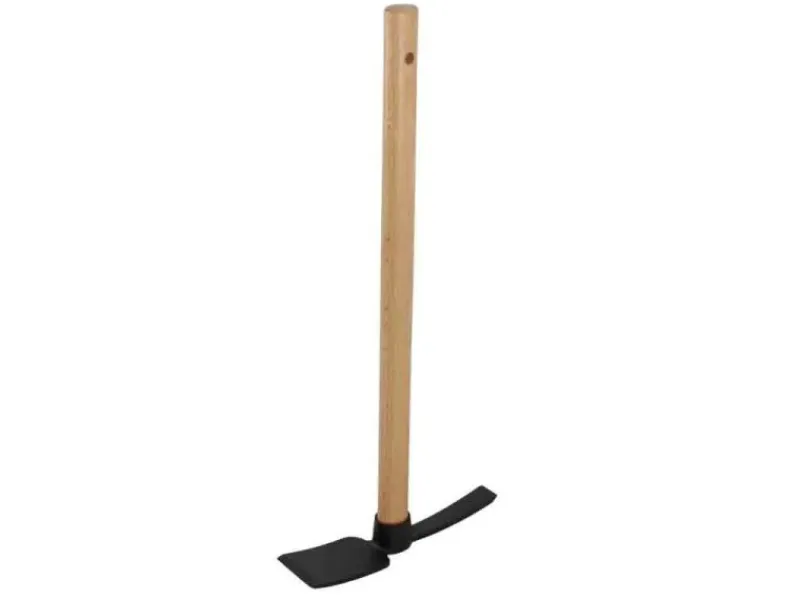 Durch den langen Holzgriff lässt sich die Kleinhacke leicht greifen. Mit dem Loch am Griff kann die Hacke außerdem leicht verstaut werden.