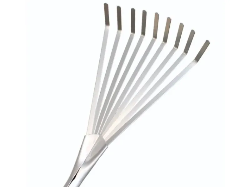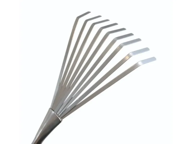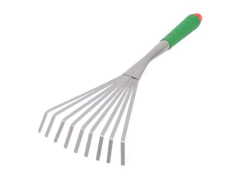 Der kleine Laubrechen aus Stahl eignet sich durch seine schmale Arbeitsbreite zum Zusammenharken von Unkraut, Laub und Gras auch an engen Stellen im Beet.