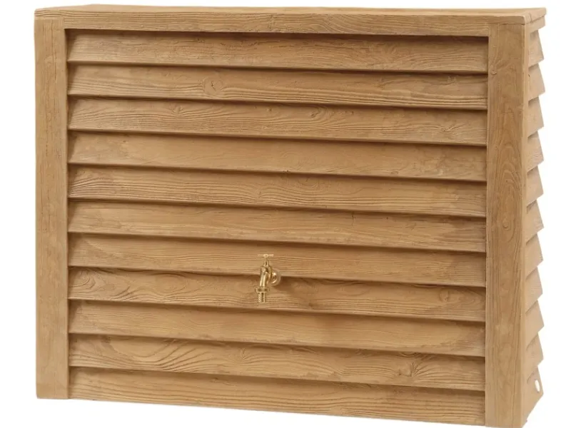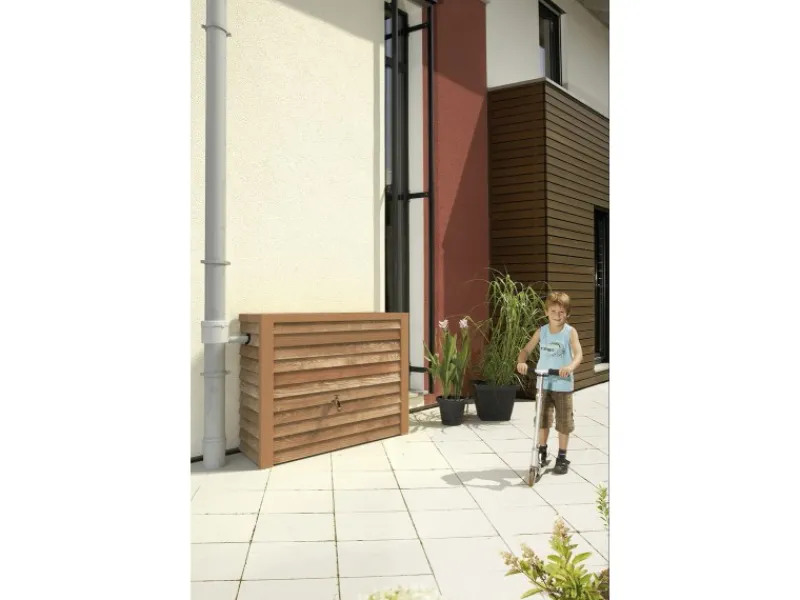 Die Regenwasserbehälter wird mit seinen kompakten Maßen von 100 cm x 124 cm x 40 cm (H x B x T) direkt an der Hauswand platziert. Hier nimmt der Tank nur wenig Platz in Anspruch, fasst aber eine beachtliche Wassermenge von 350 l. Mit seinem rustikalen Design passt der Regentank optisch zu vielen verschiedenen Häuser- und Gartentypen. Die Oberseite des Tanks können sie wunderbar als Abstellfläche für Topfpflanzen und Blumenkübel nutzen.