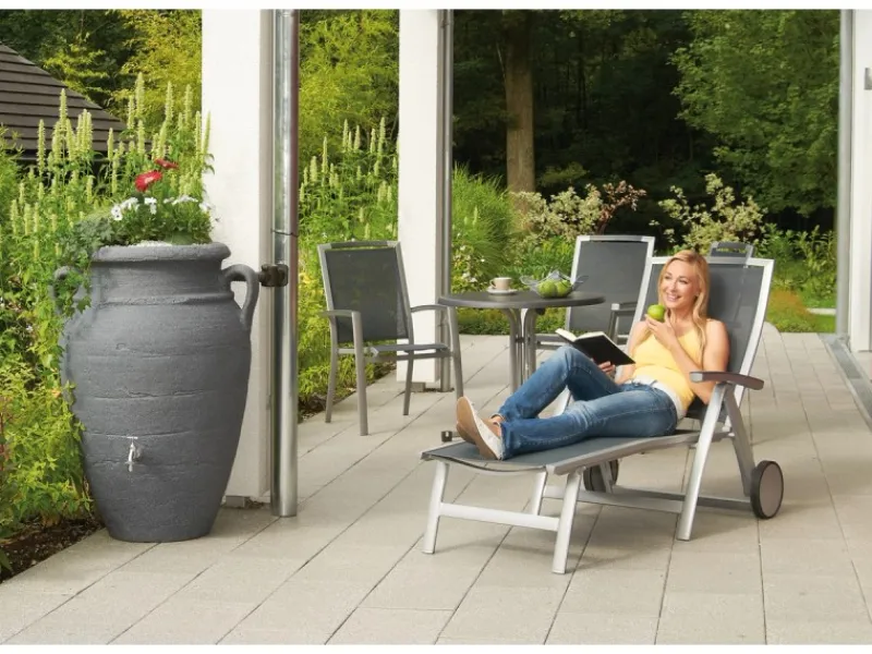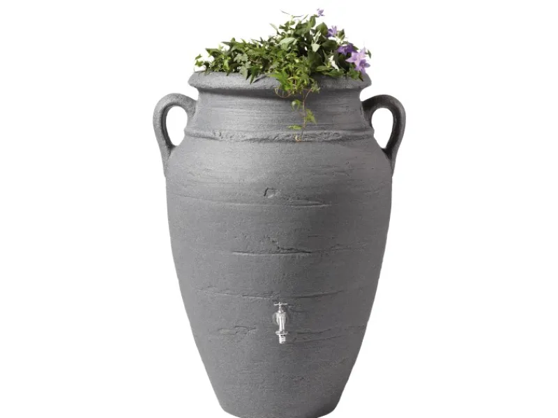 Die Wasserentnahme ist durch Auslaufhahn oder Universal-Schlauch-Set denkbar einfach. Zudem ist die Regenwasser-Amphore UV-stabil und witterungsbeständig.