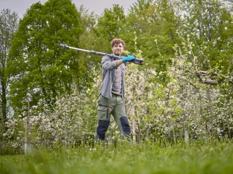 Mit dem Akku-Teleskop-Baumschere HighCut 360/18V P4A Ready-To-Use Set von Gardena ist der Baumschnitt in sehr großen Höhen einfach vom Boden aus möglich. Durch das integrierte Verlängerungsrohr überzeugt die Baumschere mit einer Länge von 3,6 Metern, wodurch bei der Arbeit eine Gesamthöhe von bis zu 5 Metern erreicht wird. Die Teleskopfunktion des Stiels sorgt beim Schneiden im Baum für eine hohe Flexibilität. Das Gestänge der HighCut ist teilbar und vereinfacht den Transport sowie die Lagerung. Die Unterstützung durch den Power for all-Akku bietet einen großen Kraftzuwachs, sodass dickere Äste von bis zu 28 mm Durchmesser leicht durchtrennt werden. Die in Deutschland hergestellten originalen Gardena Messer aus gehärtetem Stahl erlauben einen sauberen und glatten Schnitt in frischem Holz. Sie sind antihaftbeschichtet sowie präzisionsgeschliffen, sodass Schnittgut nicht an der Klinge haftet. Um einzelne vertikal gewachsene Äste effizient zu schneiden, kann der abwinkelbare und schlanke Schneidkopf in eine 60-Grad-Position gebracht werden. Das Abwinkeln erleichtert zudem die gute Sicht auf das Geschehen. Der Räumhaken am oberen Ende des Stiels dient zum Herausziehen von Ästen, falls sie nach der Durchtrennung im Geäst hängen bleiben. Die LED-Anzeige im ergonomischen Griff ermöglicht den Blick auf den Ladestatus des Akkus. Eine volle Akkuladung reicht für bis zu 200 Schnitte. Die Gardena Akku-Teleskop-Baumschere HighCut 360/18V P4A wird als Ready-To-Use-Set mit Schnellladegerät und einem 18V Power for all-Akku geliefert. Die Power for all Alliance ist eine der größten markenübergreifenden Akku-Allianzen führender Hersteller. Ihre Akkus können in vielen Produkten führender Hersteller eingesetzt werden. Man braucht also nicht für jedes einen extra Akku zu kaufen und spart Geld und Ressourcen! Gardena bietet nach einer einfachen Online-Registrierung eine Herstellergarantie von drei Jahren auf das Qualitätsprodukt.
