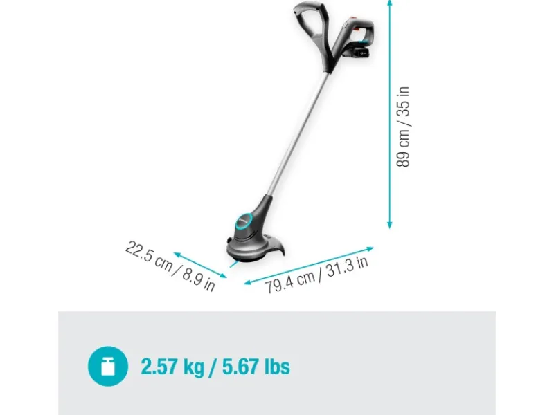 Das Akku-Trimmer Set SmallCut 23/18V P4A Ready-To-Use von Gardena ist besonders leicht und leistungsstark. Durch das geringe Gewicht von 2,0 kg mit Akku in Kombination mit der komfortablen Handhabung ist das Trimmen von Rasenkanten mühelos. Der große Handgriff und der vordere Zusatzgriff sorgen für eine gelungene Ergonomie in aufrechter Arbeitsposition. Die Schnitte sind dank der RotorCut-Kunststoffmesser mit einer Arbeitsbreite von 23 cm präzise, effizient und sauber. Die SmallCut ist besonders für das Schneiden von Ecken oder engeren Bereichen geeignet, die ein Rasenmäher nicht erreicht. Die praktische LED-Anzeige im Griff zeigt den Ladestatus des Akkus an. Eine volle Ladung des im Lieferumfang enthaltenen 2,0Ah-Akkus reicht für rund 40 Minuten Laufzeit. Zusätzlich sind im Griff vier Ersatzschneidemesser integriert. Der Gardena Akku-Trimmer SmallCut 23/18V P4A wird als Ready-To-Use-Set mit Ladegerät und einem 18V Power for all-Akku geliefert, der schnell aufgeladen wird. Die Power for All Alliance ist eine der größten markenübergreifenden Akku-Allianzen führender Hersteller. Ihre Akkus können in vielen Produkten führender Hersteller eingesetzt werden. Man braucht also nicht für jedes einen extra Akku zu kaufen und spart Geld und Ressourcen!