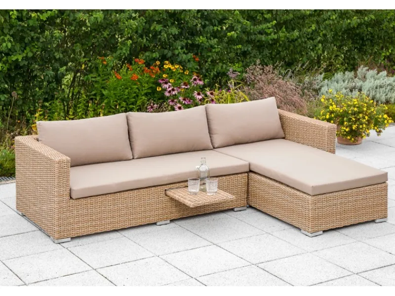 Die Garten Eckbank-Gruppe ist aus einem pulverbeschichteten Stahlgestell mit Polyrattan gefertigt. Die Tischplatte besteht aus Sicherheitsglas.