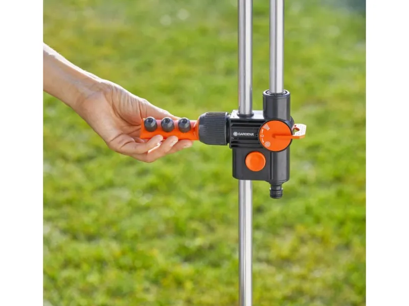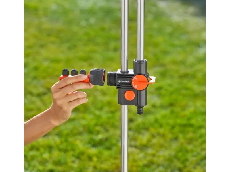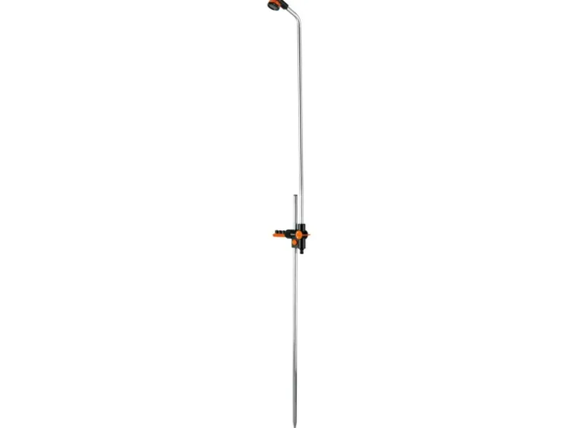 Die Gardena Gartendusche Duo: Das erfrischende Vergnügen an heißen Tagen. Den Spike einfach in den Rasen oder Sonnenschirmständer stecken. Ein Druckknopf ermöglicht eine stufenlose Höhenverstellung und ein Regulier- und Absperrventil die Mengen- und Strahlformregulierung. Es gibt 2 unterschiedliche Strahlformen zur Auswahl: Weicher und breitgefächerter Brausestrahl oder fein einstellbarer Sprühnebel.