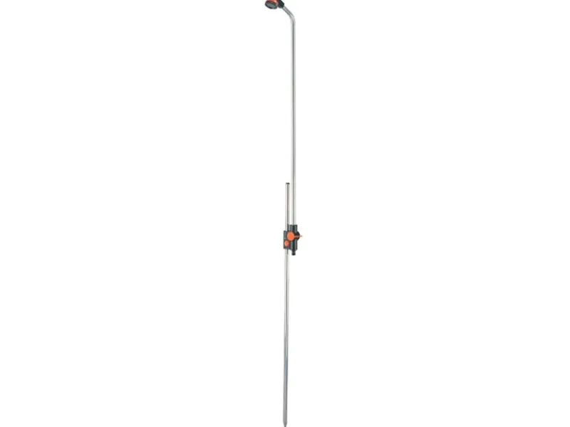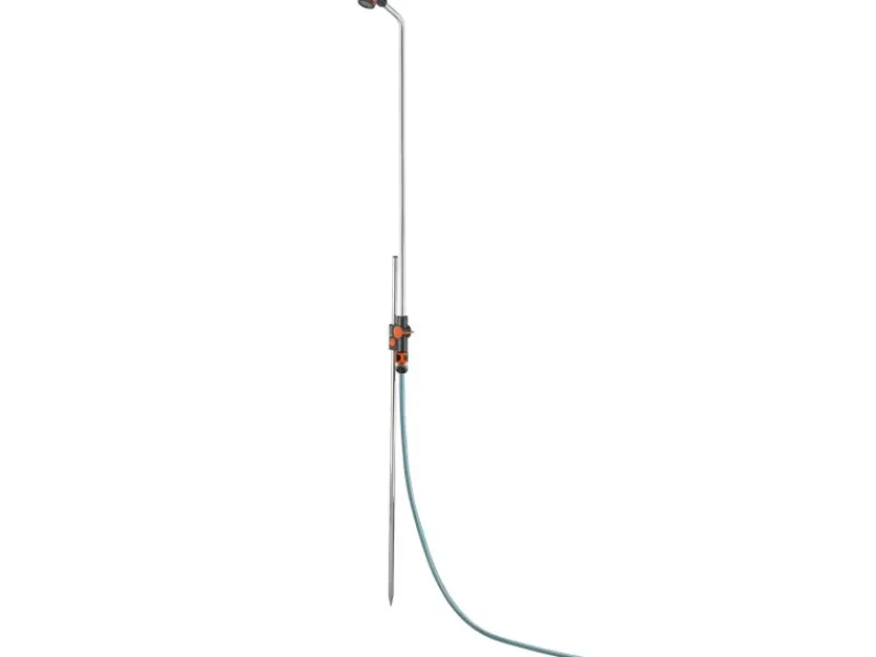 Die Gardena Gartendusche Solo: Das erfrischende Vergnügen an heißen Tagen. Den Spike einfach in den Rasen oder Sonnenschirmständer stecken. Ein Druckknopf ermöglicht eine stufenlose Höhenverstellung und ein Regulier- und Absperrventil die Mengen- und Strahlformregulierung. Es gibt 2 unterschiedliche Strahlformen zur Auswahl: Weicher und breitgefächerter Brausestrahl oder fein einstellbarer Sprühnebel.