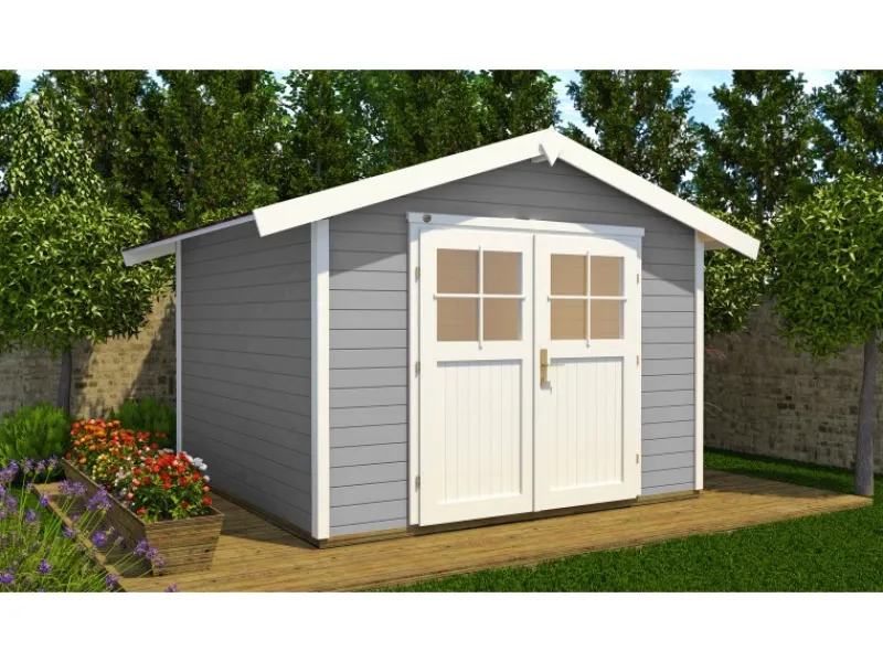 Die Wandbohlen des weka Gartenhaus 122 sind außen in einer wetterfesten Farbe grau lasiert, um sie vor UV-Strahlung und Witterungseinflüssen zu schützen. So ist kein zeitaufwändiger Erstanstrich erforderlich und Sie können Ihr Gartenhaus sofort nach dem Aufbau genießen. Die Innenwände, der Fußboden und das Dach werden bei diesem Gartenhaus naturbelassen geliefert, damit der natürliche Holzcharakter im Innenraum erhalten bleibt. Zum Schutz vor Witterung ist die Tür bei dem weka Gartenhaus 122 bereits beidseitig weiß lasiert.