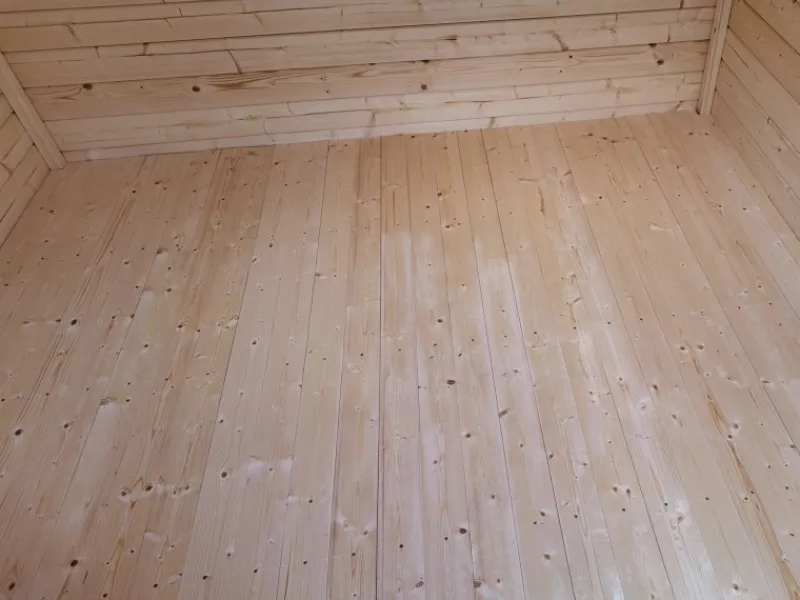 Der Fußboden des Gartenhauses besteht aus einer Unterkonstruktion aus kesseldruckimprägnierten Bodenbalken und 16 mm starken Bodendielen mit Nut und Feder. Dies garantiert Ihnen eine zuverlässige Konstruktion.