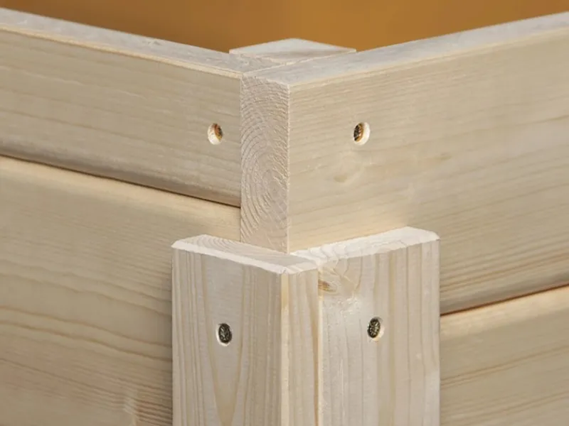 Das moderne Schraubsystem des Gartenhaus 122 ermöglicht eine einfache und schnelle Montage. Diese Eckverbindung erfüllt die hohen Ansprüche für ein zuverlässiges und hochwertiges Produkt. Die Wandbohlen werden über Eck, zusammen mit einem stabilen Eckpfosten, verschraubt. Von außen schützen Deckleisten die Stirnkanten vor der Witterung und sorgen für eine schöne Optik.