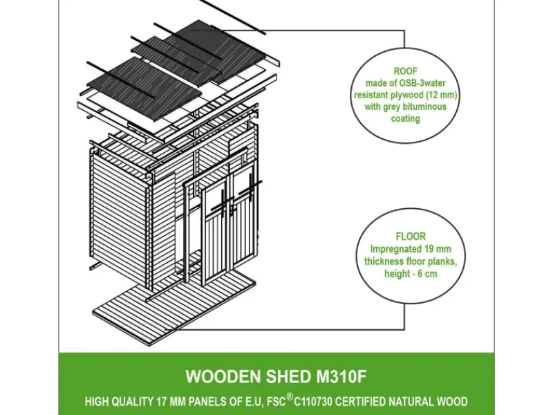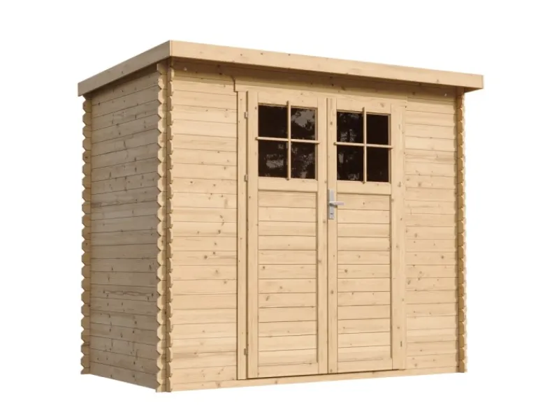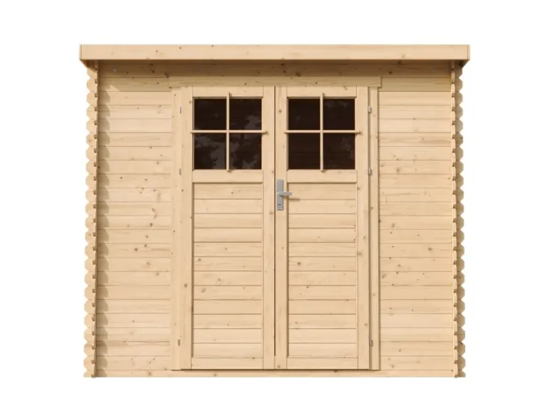 Das Gartenhaus ist aus unbehandeltem Holz in Blockbohlenbauweise gefertigt. Durch die naturbelassene Oberfläche bleibt eine natürliche Optik mit Holzmaserung erhalten. Zum Schutz vor Witterungseinflüssen sollte die Oberfläche individuell mit einer Lackierung oder Lasierung veredelt werden. Das Gerätehaus verfügt über eine stabile Konstruktion, mit einer Wandstärke von 19 mm. Die maximalen Schneelast des Flachdachs liegt bei 30 kg/m. Aufgrund der speziellen Dachform eignen sich hochwertige Dachbahnen besonders gut als Dacheindeckung.