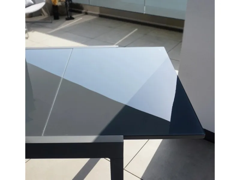 Seine Aluminiumstruktur ist leicht und rostfrei. Die besondere Optik verdankt der Tisch der Kombination aus der ca. 5 mm dicken Tischplatte und dem anthrazitfarbenen Aluminiumgestell.