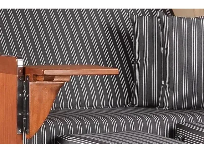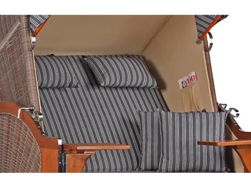 Herrliches Freizeit-Feeling mit dem Strandkorb Nordstrand Mahagoni Es muss ja nicht immer die Ost- oder Nordsee sein- auch in Ihrem eigenen Garten oder auf dem Balkon können Sie in einem unserer Strandkörbe mit Wechselpolster nach Herzenslust die Seele baumeln lassen. Die ausgesprochen exzellente und bis ins kleinste Detail ausgeführte hervorragende Verarbeitung weckt bei diesem Volllieger bereits die Lust, es sich nach der Betriebsamkeit des Alltags in diesem Strandkorb so richtig gemütlich zu machen. Auf Grund der Design- Vielfalt, die wir Ihnen bezüglich der Polsterung präsentieren, haben Sie die Möglichkeit, sich den Strandkorb Nordstrand nach Ihren ganz persönlichen Wünschen zu gestalten. So schaffen Sie sich einen unverwechselbaren und individuellen Rückzugsort mit charakteristischer Optik, der Sie auf hohem Niveau zur Entschleunigung einlädt. Hochwertiges Mahagoniholz Dass für den Strandkorb Nordstrand verwendete Mahagoniholz überzeugt durch seinen edlen, rötlich-braunen Farbton, der dem Strandkorb seinen klassischen und maritimen Charakter verleiht. Zudem sorgt das massive Mahagoniholz für Standfestigkeit und Stabiltität und macht den Strandkorb Nordstrand zu einem hochwertigen Gartenmöbel. Die Verwendung von Mahagoniholz im Außenbereich hat eine lange Tradition. Das besonders harte und damit witterungsbeständige Holz wird von jeher sowohl im Schiffsbau als auch im Gartenbereich eingesetzt. Somit eignet es sich auch für die Herstellung von Strandkörben besonders gut. Um das Mahagoniholz in seiner einzigartigen Optik zu erhalten, empfehlen wir die regelmäßige Lackierung des Holzes mit einem offenporigen PU-Lack. Diese Pflege macht den Strandkorb Nordstrand zu einem absoluten Highlight in Ihrem Garten oder auf Ihrer Terrasse. Langlebiges PE-Geflecht Die aufwendig gestaltete Flechtung des Strandkorbes wird in liebevoller Handarbeit für jeden Strandkorb einzeln erstellt. Die interessante Sonnenflechtung des Seitenteils und die akkurate Verarbeitung der Oberkorbs zeugen von hohem handwerklichem Geschick und verleihen dem Strandkorb Nordstrand sein klassisches Design. Das verwendete PE (Polyethylen)-Geflecht ist ideal für den Einsatz im Freien, denn es ist robust und temperaturbeständig, besonders auch bei hohen Temperaturschwankungen. Zudem ist die glatte Oberfläche des Geflechtes schmutz- und witterungsabweisend. Weitere Vorteile wie UV-Beständigkeit und Farbechtheit machen Ihren Strandkorb Nordstrand zu einem langjährigen Begleiter, an dem Sie lange Ihre Freude haben werden. Edelstahl und viele Extras Neben dem massiven Teakholz und beständigen PE-Geflecht verwenden wir für unseren Strandkorb Nordstrand ausschließlich hochwertige Edelstahlbeschläge aus V2A-Edelstahl. Diese Beschläge kommen bei der Befestigung der Bistrotische, der Verstärkung der unteren Ecken und beim Feststellmechanismus der Verstellgriffe zum Einsatz. Doch auch die verwendeten Schrauben, sowie die Haken zur Befestigung der abnehmbaren Fußstützen sind bewusst aus Edelstahl gewählt. Komplettiert wird der Strandkorb Nordstrand durch eine Vielzahl durchdachter Extras. Das großzügige Staufach unter der Sitzbank, die beiden Zeitungstaschen und die großen schwenkbaren Bistrotische sind praktische Details, die Ihre Auszeit im Strandkorb Nordstrand perfekt machen. Zudem sorgen extradicke Polster für einen bequemen Sitzkomfort. Der Strandkorb Nordstrand wird grundsätzlich mit farblich abgestimmten Wurf- und Nackenkissen geliefert, die sich variabel einsetzen lassen. Somit lässt der Strandkorb Nordstrand keine Wünsche offen – lassen Sie sich von unserer vielfältigen Auswahl inspirieren.
