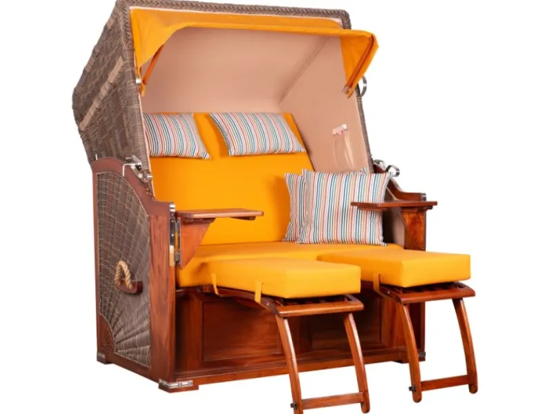Herrliches Freizeit-Feeling mit dem Strandkorb Nordstrand Mahagoni Es muss ja nicht immer die Ost- oder Nordsee sein- auch in Ihrem eigenen Garten oder auf dem Balkon können Sie in einem unserer Strandkörbe mit Wechselpolster nach Herzenslust die Seele baumeln lassen. Die ausgesprochen exzellente und bis ins kleinste Detail ausgeführte hervorragende Verarbeitung weckt bei diesem Volllieger bereits die Lust, es sich nach der Betriebsamkeit des Alltags in diesem Strandkorb so richtig gemütlich zu machen. Auf Grund der Design- Vielfalt, die wir Ihnen bezüglich der Polsterung präsentieren, haben Sie die Möglichkeit, sich den Strandkorb Nordstrand nach Ihren ganz persönlichen Wünschen zu gestalten. So schaffen Sie sich einen unverwechselbaren und individuellen Rückzugsort mit charakteristischer Optik, der Sie auf hohem Niveau zur Entschleunigung einlädt. Hochwertiges Mahagoniholz Dass für den Strandkorb Nordstrand verwendete Mahagoniholz überzeugt durch seinen edlen, rötlich-braunen Farbton, der dem Strandkorb seinen klassischen und maritimen Charakter verleiht. Zudem sorgt das massive Mahagoniholz für Standfestigkeit und Stabiltität und macht den Strandkorb Nordstrand zu einem hochwertigen Gartenmöbel. Die Verwendung von Mahagoniholz im Außenbereich hat eine lange Tradition. Das besonders harte und damit witterungsbeständige Holz wird von jeher sowohl im Schiffsbau als auch im Gartenbereich eingesetzt. Somit eignet es sich auch für die Herstellung von Strandkörben besonders gut. Um das Mahagoniholz in seiner einzigartigen Optik zu erhalten, empfehlen wir die regelmäßige Lackierung des Holzes mit einem offenporigen PU-Lack. Diese Pflege macht den Strandkorb Nordstrand zu einem absoluten Highlight in Ihrem Garten oder auf Ihrer Terrasse. Langlebiges PE-Geflecht Die aufwendig gestaltete Flechtung des Strandkorbes wird in liebevoller Handarbeit für jeden Strandkorb einzeln erstellt. Die interessante Sonnenflechtung des Seitenteils und die akkurate Verarbeitung der Oberkorbs zeugen von hohem handwerklichem Geschick und verleihen dem Strandkorb Nordstrand sein klassisches Design. Das verwendete PE (Polyethylen)-Geflecht ist ideal für den Einsatz im Freien, denn es ist robust und temperaturbeständig, besonders auch bei hohen Temperaturschwankungen. Zudem ist die glatte Oberfläche des Geflechtes schmutz- und witterungsabweisend. Weitere Vorteile wie UV-Beständigkeit und Farbechtheit machen Ihren Strandkorb Nordstrand zu einem langjährigen Begleiter, an dem Sie lange Ihre Freude haben werden. Edelstahl und viele Extras Neben dem massiven Teakholz und beständigen PE-Geflecht verwenden wir für unseren Strandkorb Nordstrand ausschließlich hochwertige Edelstahlbeschläge aus V2A-Edelstahl. Diese Beschläge kommen bei der Befestigung der Bistrotische, der Verstärkung der unteren Ecken und beim Feststellmechanismus der Verstellgriffe zum Einsatz. Doch auch die verwendeten Schrauben, sowie die Haken zur Befestigung der abnehmbaren Fußstützen sind bewusst aus Edelstahl gewählt. Komplettiert wird der Strandkorb Nordstrand durch eine Vielzahl durchdachter Extras. Das großzügige Staufach unter der Sitzbank, die beiden Zeitungstaschen und die großen schwenkbaren Bistrotische sind praktische Details, die Ihre Auszeit im Strandkorb Nordstrand perfekt machen. Zudem sorgen extradicke Polster für einen bequemen Sitzkomfort. Der Strandkorb Nordstrand wird grundsätzlich mit farblich abgestimmten Wurf- und Nackenkissen geliefert, die sich variabel einsetzen lassen. Somit lässt der Strandkorb Nordstrand keine Wünsche offen – lassen Sie sich von unserer vielfältigen Auswahl inspirieren.