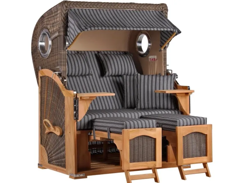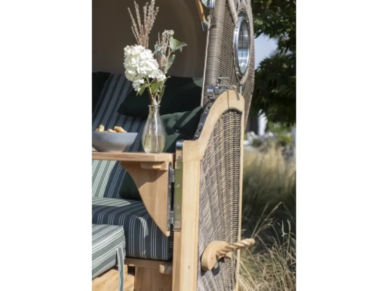 Strandkorb Rantum Teak – Maritimer Charme im eigenen Garten Der Strandkorb Rantum aus elegantem Teakholz lässt Sie mit seiner komfortablen Ausstattung den Alltag vergessen. Dicke hochwertige Polster, weiche Nackenkissen und verstellbare Fußstützen sorgen für angenehmes Sitzen. Für Freunde der besonderen Bequemlichkeit lässt er sich ganz einfach zum Volllieger umfunktionieren. Der Oberkorb ist in mehreren Stufen verstellbar, sodass Sie sich ihren Sonnensitz leicht nach Ihren Bedürfnissen gestalten können. Mit seinem Bullauge, seiner Sonnenmarkise und seinem grauen PE-Rattangeflecht verbreitet er das Urlaubsambiente, das Sie zur Entspannung brauchen. Teakholz beeindruckt zum einen durch seine elegante Ausstrahlung, zum andern durch seine praktischen stark wasserabweisenden Eigenschaften. In Verbindung mit dem hochwertigen witterungsbeständigen PE-Geflecht bildet dieser Strandkorb ein Meisterwerk, das Sie sowohl im Terrassen- und Gartenbereich, als auch innerhalb Ihres Hauses platzieren können. Hochwertiges Teakholz Der Strandkorb Rantum überzeugt durch die besonders hochwertig verarbeiteten edlen Materialien. Das massive Teakholz mit seinem warmen, hellen Farbton verleiht dem Strandkorb Rantum seinen ganz besonderen Charakter und macht ihn zu einem qualitativ hochwertigen Gartenmöbel. Teakholz ist ein besonders hochwertiges Holz und eignet sich aufgrund seiner hochwertig Eigenschaften hervorragend für Strandkörbe. Wir verwenden ausschließlich hochwertig produziertes Plantagen-Teakholz. Aufgrund seines hohen Öl- und Kautschukanteils hat Teakholz einen hochwertig Verwitterungs- und Alterungsschutz. Egal ob Sie die im Laufe der Zeit entstehende silbrig-graue Patina lieben oder den hochwertig hellen Farbton bevorzugen, der sich durch regelmäßiges Ölen des Holzes erhalten lässt – unser Teakholz überzeugt durch seine Langlebigkeit und die hochwertige Optik. Langlebiges PE-Geflecht Die aufwendig gestaltete Flechtung des Strandkorbes wird in liebevoller Handarbeit für jeden Strandkorb einzeln erstellt. Die interessante Sonnenflechtung des Seitenteils und die formschöne Einbindung des Bullauges zeugen von hohem handwerklichem Geschick und verleihen dem Strandkorb Rantum ein außergewöhnliches und einzigartiges Design. Das verwendete PE (Polyethylen)-Geflecht ist ideal für den Einsatz im Freien, denn es ist robust und temperaturbeständig, besonders auch bei hohen Temperaturschwankungen. Zudem ist die glatte Oberfläche des Geflechtes schmutz- und witterungsabweisend. Weitere Vorteile wie UV-Beständigkeit und Farbechtheit machen Ihren Strandkorb Rantum zu einem langjährigen Begleiter, an dem Sie lange Ihre Freude haben werden. Edelstahl und viele Extras Neben dem massiven Teakholz und beständigen PE-Geflecht verwenden wir für unseren Strandkorb Rantum ausschließlich hochwertige Edelstahlbeschläge aus V2A-Edelstahl. Diese Beschläge kommen bei der Befestigung der Bistrotische, der Verstärkung der unteren Ecken und beim Feststellmechanismus der Verstellgriffe zum Einsatz. Komplettiert wird der Strandkorb Rantum durch eine Vielzahl durchdachter Extras. So verfügt der Strandkorb Rantum nicht nur über eine extra-dicke Polsterung, sondern auch über farblich passende Wurfkissen und verstellbare Nackenkissen. Zeitungstaschen, integrierte Armlehnen, zwei große, schwenkbare und zudem abnehmbare Bistrotische und ein praktisches Staufach unterhalb der Sitzfläche lassen keine Wünsche offen und machen den Strandkorb Rantum bald auch zu Ihrem Lieblingsplatz im Garten oder auf der Terrasse.